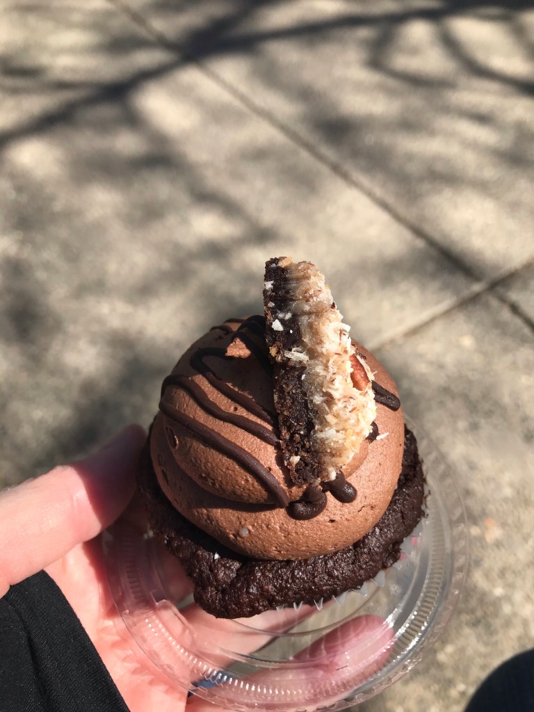 I met a friend for an outdoor chat and then set off with several free hours and no agenda. Naturally, I was drawn to find some yummy treats on this journey. π I splurged on an organic, gluten-free, vegan cupcake that was almost as heavenly as sitting in the sunshine somewhere besides my porch for a change. Not the greatest photo, but it isnβt all that easy to balance a very dear dessert in one hand and snap a pic with the other in the middle of a public park!