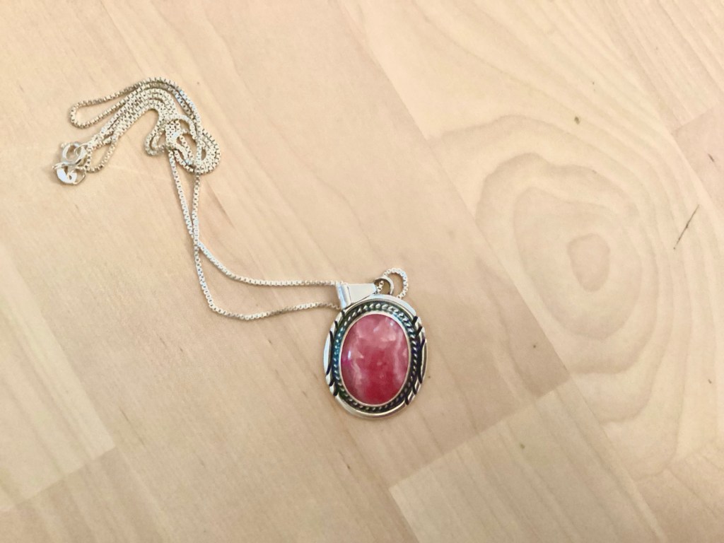 Rather than looking for a particular type of stone, I browsed. I waited for something to call out to me. A gorgeous rosy stone with delicate white swirls caught my attention. I nearly choked when I saw the price tag, but there was a smaller pendant next to it that didn’t blow my budget out of the water.